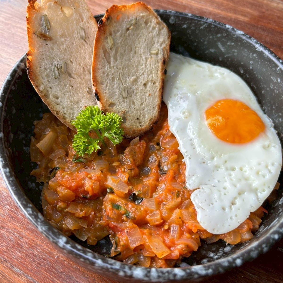 Shakshuka with Fried Egg and Bread